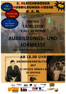 Am Freitag, 13.09.2019, 09:00-13:30 Uhr findet die Messe im Kulturhaus Bleicherode statt. Ca. 35 Aussteller werben für Ausbildungsplätze und Karriere in regionalen Unternehmen.